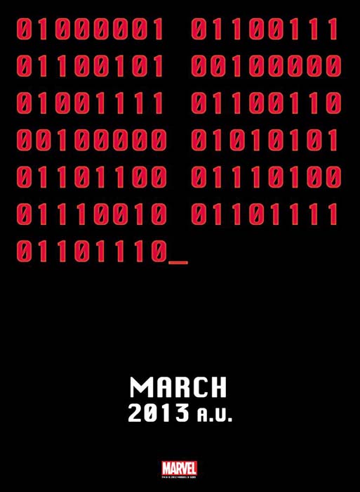 Partiendo de esto, Marvel acaba de lanzar un teaser con código binario (que seguramente dice algo y pronto alguien se encargará de descifrar) en el que podemos ver Marzo 2013 A.U.